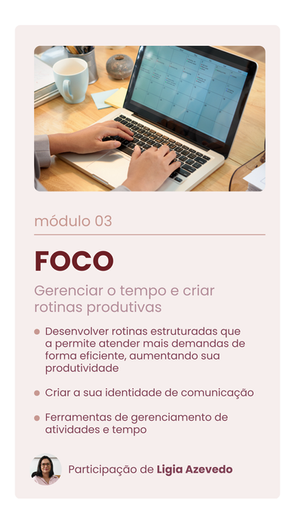 Serão 8 encontros individuais online, com foco principal no desenvolvimento profissional, aliado à estratégia e à estruturação de serviços. Essa mentoria foi criada para impulsionar sua carreira e oferecer o suporte necessário para construir uma trajetória sólida e de destaque como assistente financeira virtual.